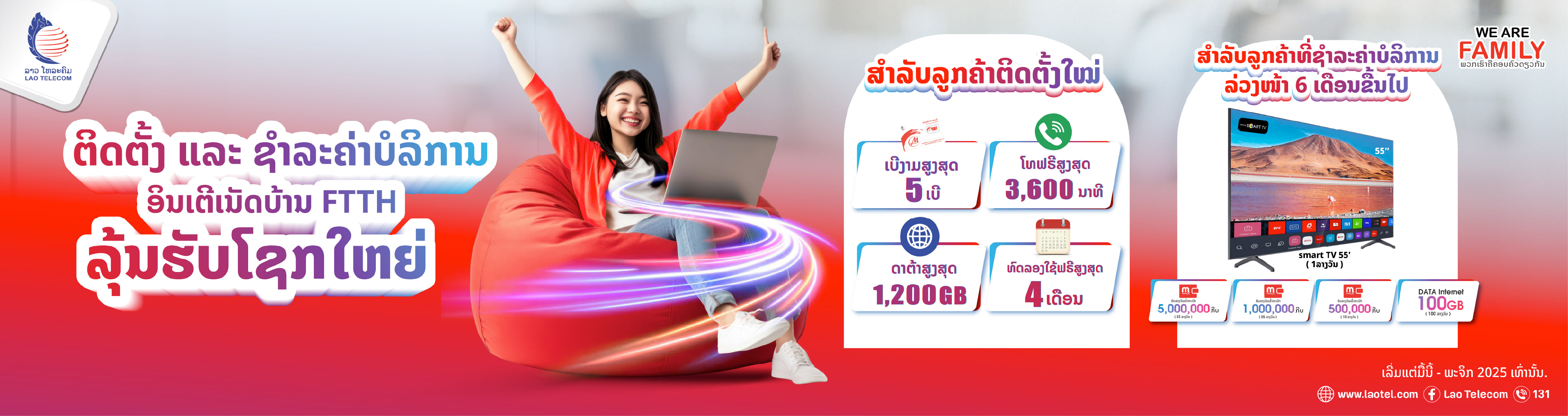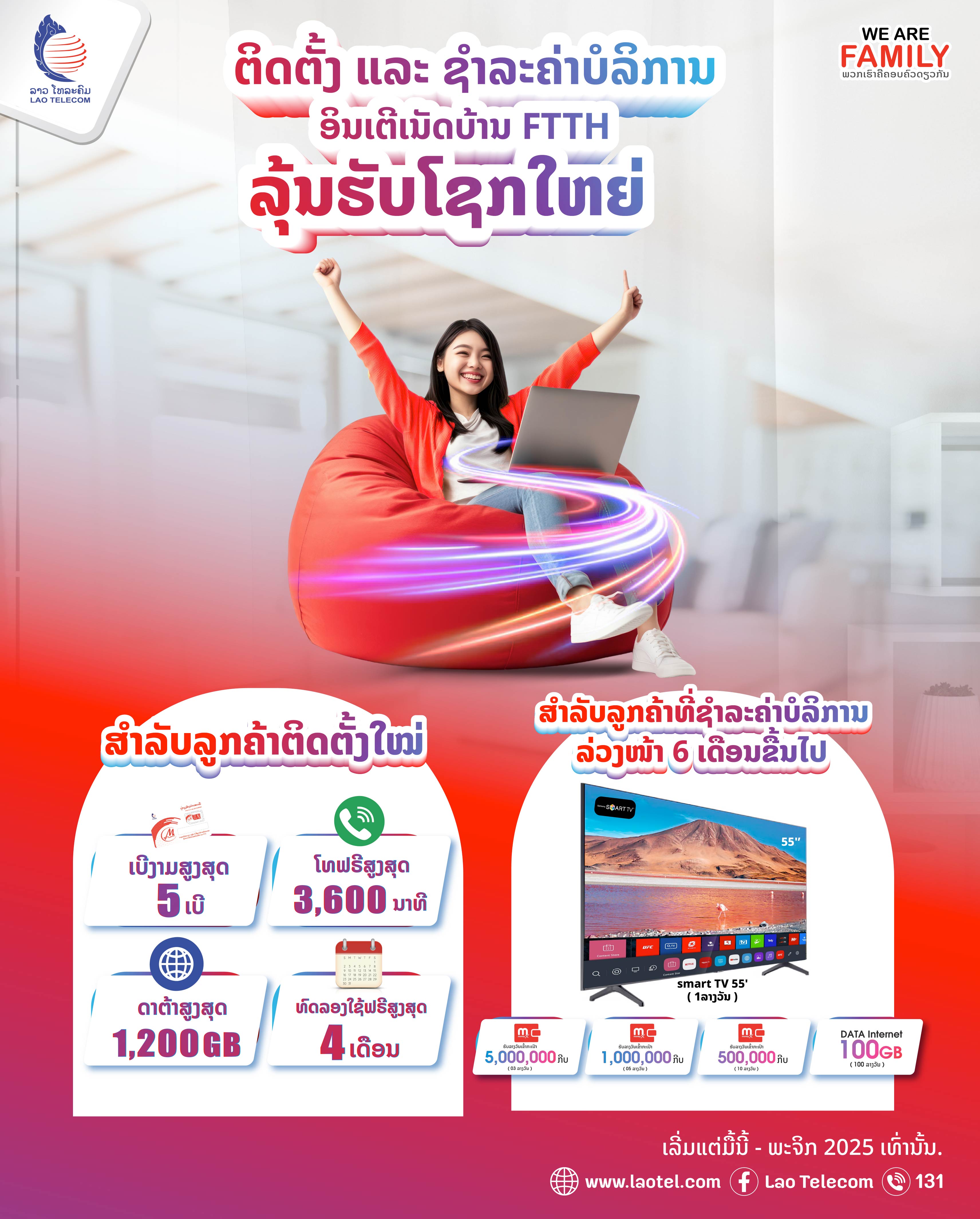 ຢ່າພາດ! ພຽງແຕ່ ຕິດຕັ້ງໃໝ່ ຫຼື ຊຳລະຄ່າບໍລິການ FTTH ຂອງທ່ານ. ເຂົ້າຮ່ວມງ່າຍໆ, ລຸ້ນຮັບໂຊກໃຫຍ່ສຸດປັງ! 💸
