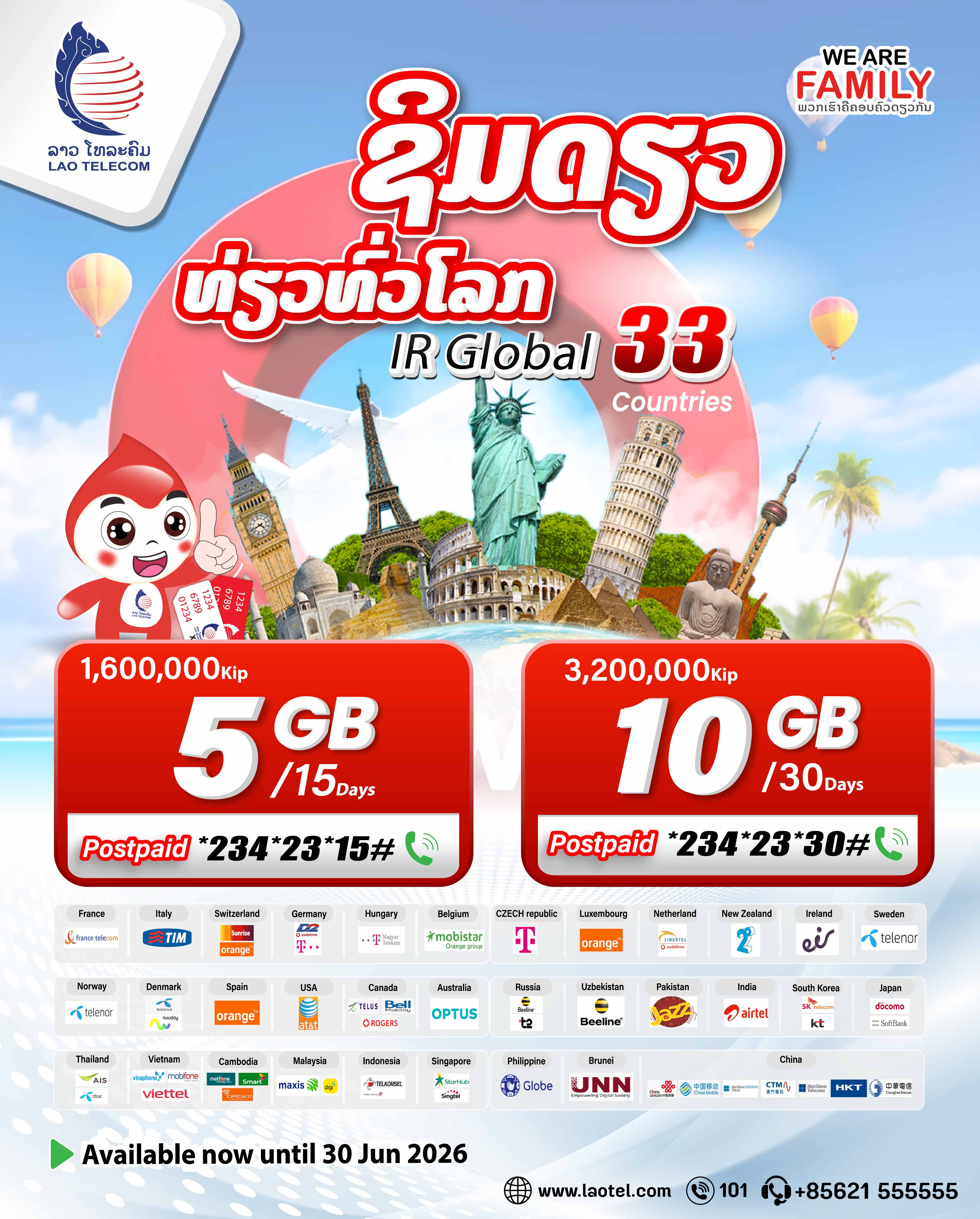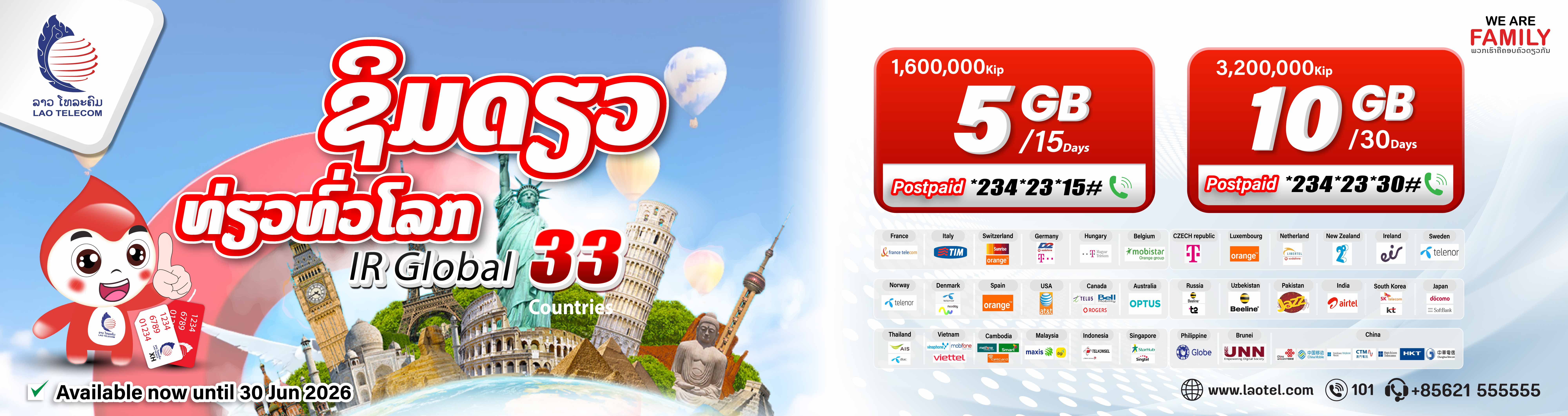 ບໍລິການໜຶ່ງຂອງໂທລະສັບມືຖືແບບຕື່ມເງິນ ແລະ ມືຖືລາຍເດືອນ ທີ່ໃຫ້ທ່ານສາມາດນໍາເອົາໂທລະສັບມືຖືຂອງທ່ານໄປນໍາໃຊ້ໄດ້ໃນຕ່າງປະເທດທີ່ມີສັນຍາຮ່ວມກັນໃນການເປີດໃຫ້ບໍລິການ IR ກັບ ລາວໂທລະຄົມ.
