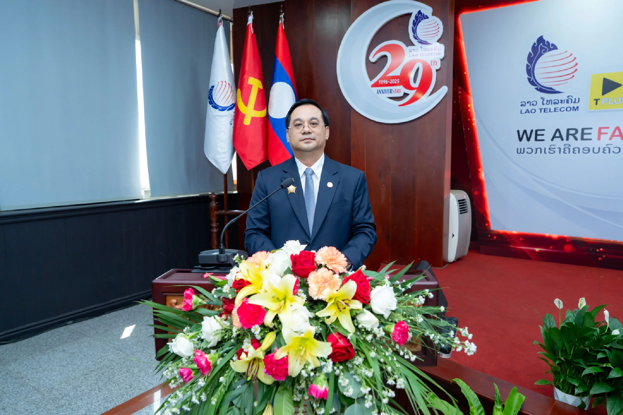 ເລຂາຄະນະພັກຮາກຖານ, ຜູ້ອຳນວຍການໃຫຍ່ ບໍລິສັດ ລາວ ໂທລະຄົມມະນາຄົມ ມະຫາຊົນ, ໃຫ້ກຽດເຂົ້າຮ່ວມມີ ທ່ານ ປອ. ສັນຕິສຸກ ສິມມາລາວົງ ກຳມະການສູນກາງພັກ, ເລຂາຄະນະພັກ, ລັດຖະມົນຕີ